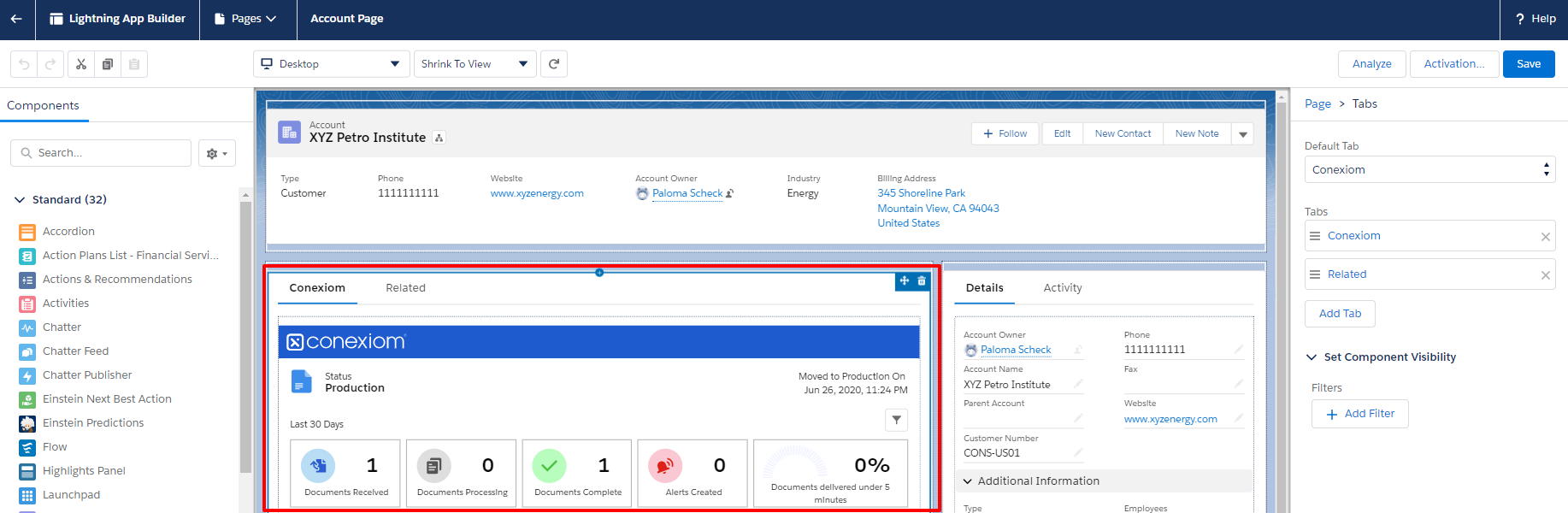Use the Lightning App builder to create or modify an existing Account Record Lightning Page to configure where your users view Conexiom customer information. Add the Custom Managed component named appContainer to this page.