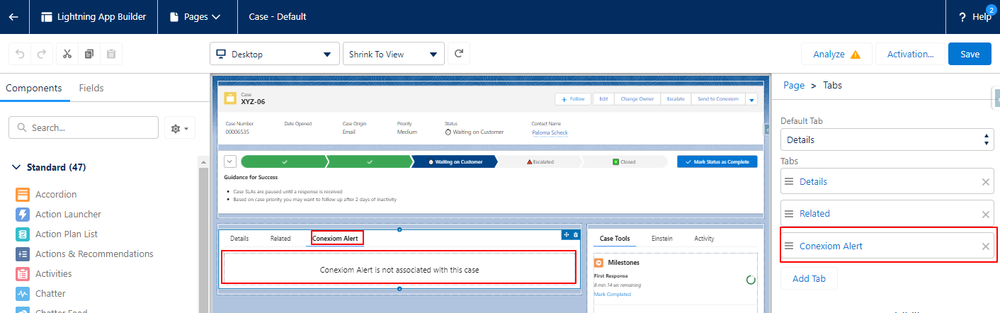 Add the alert component to any Lightning Pages where your users view alerts in cases, including the Conexiom Lightning App. Using the Lightning App builder, add the Custom Managed component named caseAlertContainer.