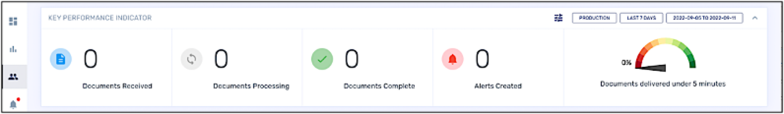 The software that drives the graphs are called “widgets.” These Key Performance Indicators show usage statistics after an account is in production. They display information such as the number of documents that are received, the number of documents that are processing, the number of documents that are complete, and the number of alerts. You can filter widget values by document type and document date.