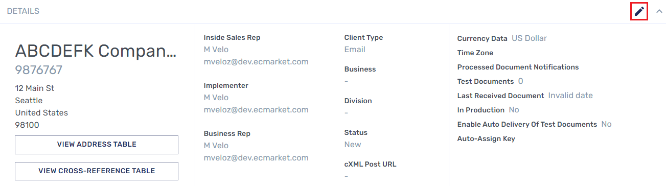 On the left side of the header, you can see the status of customer or vendor, which indicates their current condition within the system. This is the same status as seen on the main Customers or Vendors Tab. It indicates where in the implementation process the trading partner lies in regard to being fully in Production, which is the final status. For example, “Information Required” indicates that there is a question or clarification that needs to be made regarding a change request. (See Trading Partner Statuses).