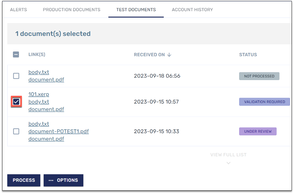 Check each box that corresponds to the documents with the status of "Validation Required."